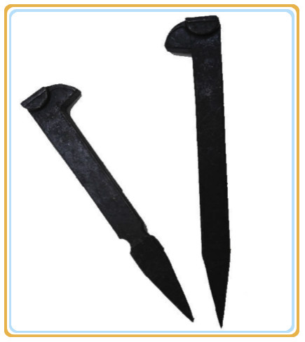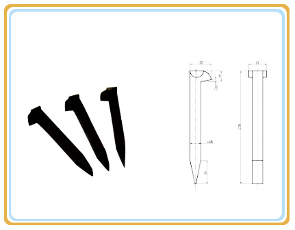 The dog spikes are roughly chisel-shaped with a flat-edged point. The spike is driven into the sleeper with the edge against the grain.
