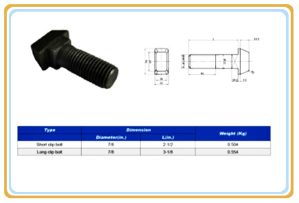 We produce the short clip bolt and long clip bolt with BSW thread for the African market. Round or square necks are mainly used with steel sleeper assemblies together with rail clips.